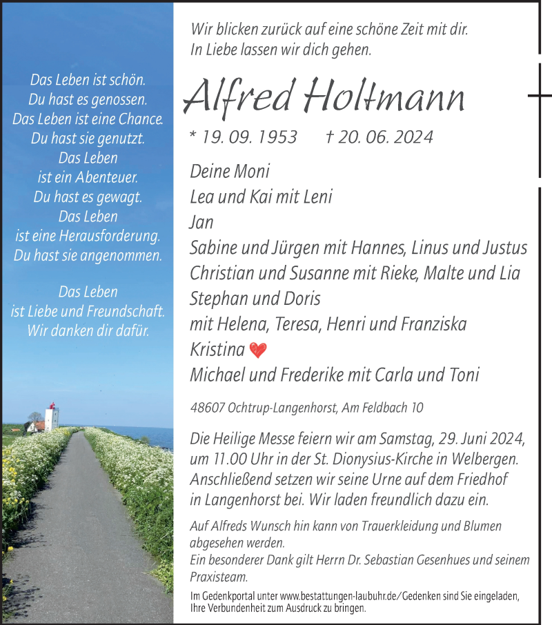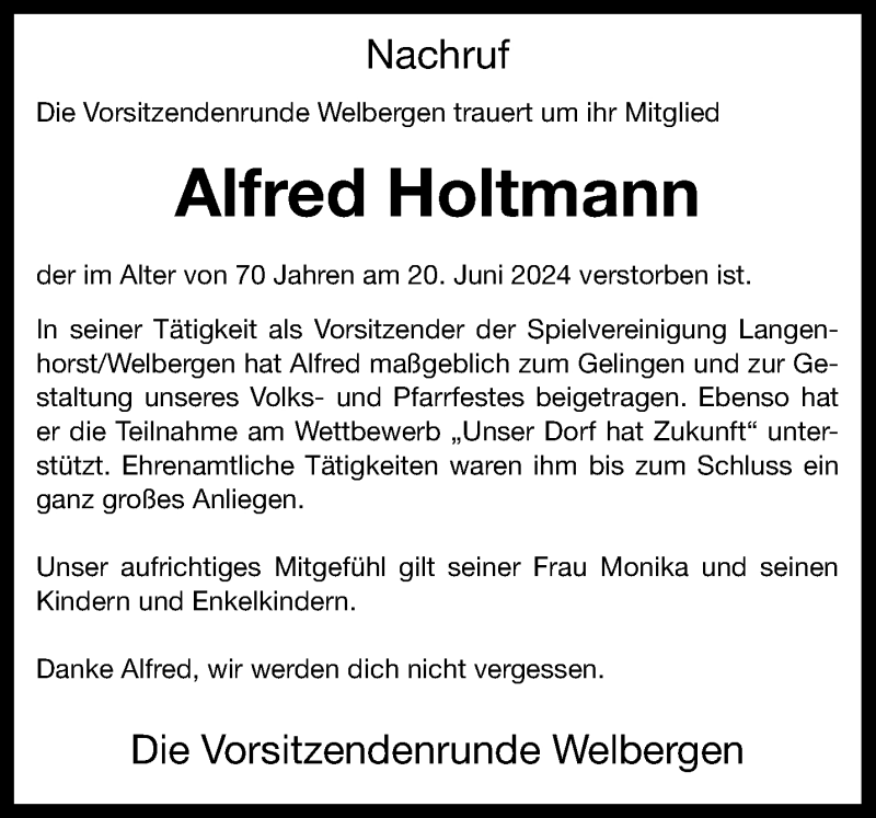 Hier finden Sie alle Traueranzeigen aus der Zeitung, die bisher für Alfred Holtmann erschienen sind. Weitere Traueranzeigen, die in der Zeitung erscheinen, werden hier ebenfalls aufgelistet