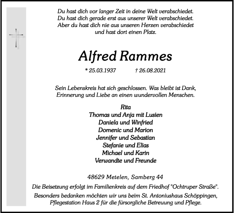 Hier finden Sie alle Traueranzeigen aus der Zeitung, die bisher für Alfred Rammes erschienen sind. Weitere Traueranzeigen, die in der Zeitung erscheinen, werden hier ebenfalls aufgelistet