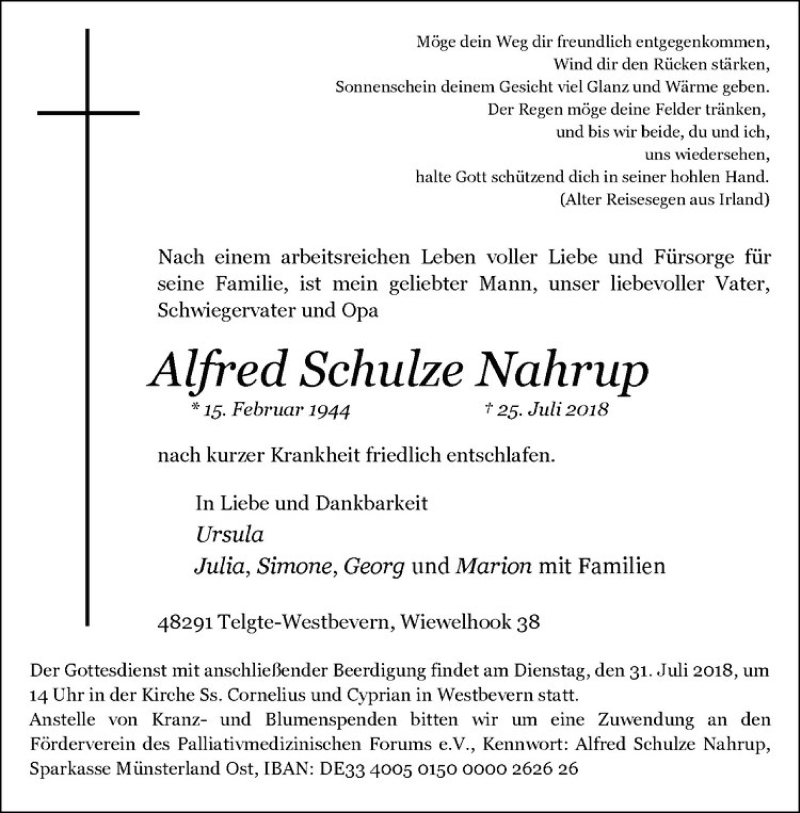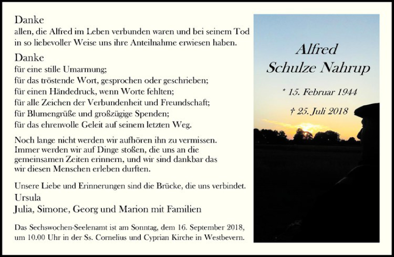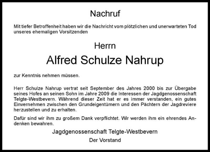 Hier finden Sie alle Traueranzeigen aus der Zeitung, die bisher für Alfred Schulze Nahrup erschienen sind. Weitere Traueranzeigen, die in der Zeitung erscheinen, werden hier ebenfalls aufgelistet