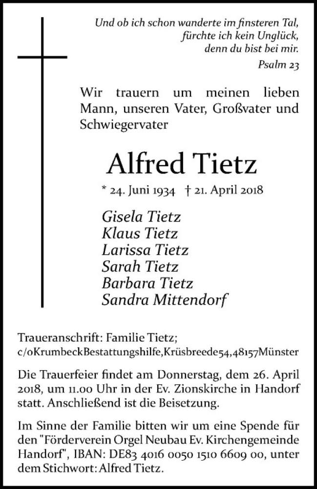 Hier finden Sie alle Traueranzeigen aus der Zeitung, die bisher für Alfred Tietz erschienen sind. Weitere Traueranzeigen, die in der Zeitung erscheinen, werden hier ebenfalls aufgelistet