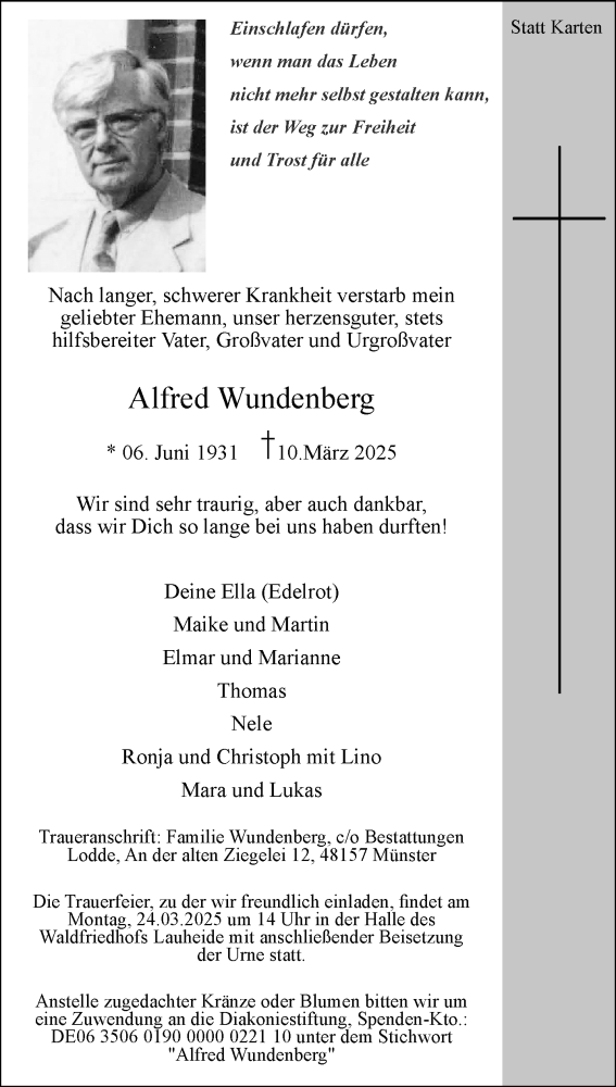 Hier finden Sie alle Traueranzeigen aus der Zeitung, die bisher für Alfred Wundenberg erschienen sind. Weitere Traueranzeigen, die in der Zeitung erscheinen, werden hier ebenfalls aufgelistet