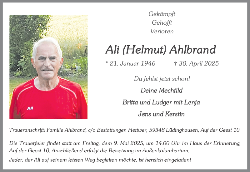 Hier finden Sie alle Traueranzeigen aus der Zeitung, die bisher für Ali Helmut Ahlbrand erschienen sind. Weitere Traueranzeigen, die in der Zeitung erscheinen, werden hier ebenfalls aufgelistet