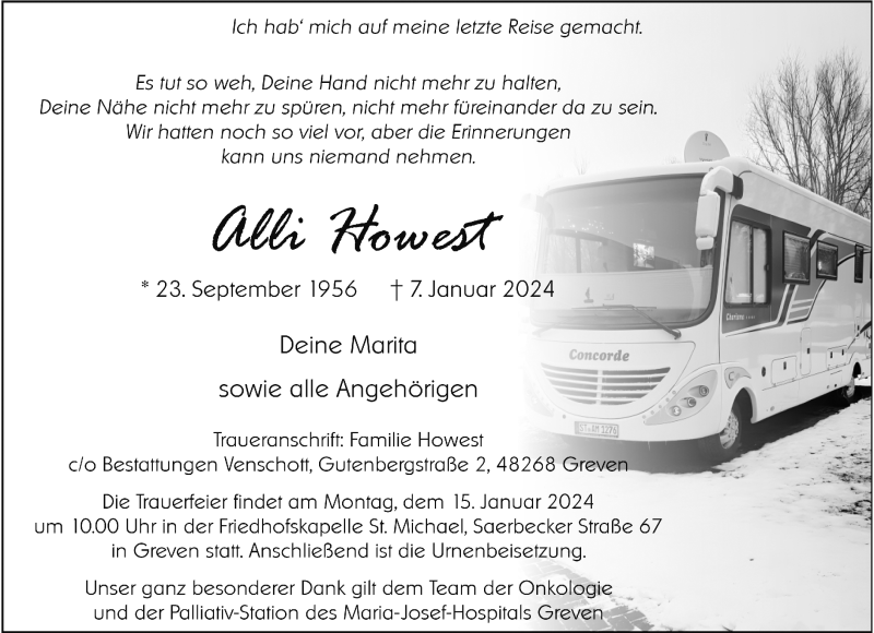 Hier finden Sie alle Traueranzeigen aus der Zeitung, die bisher für Alli Howest erschienen sind. Weitere Traueranzeigen, die in der Zeitung erscheinen, werden hier ebenfalls aufgelistet