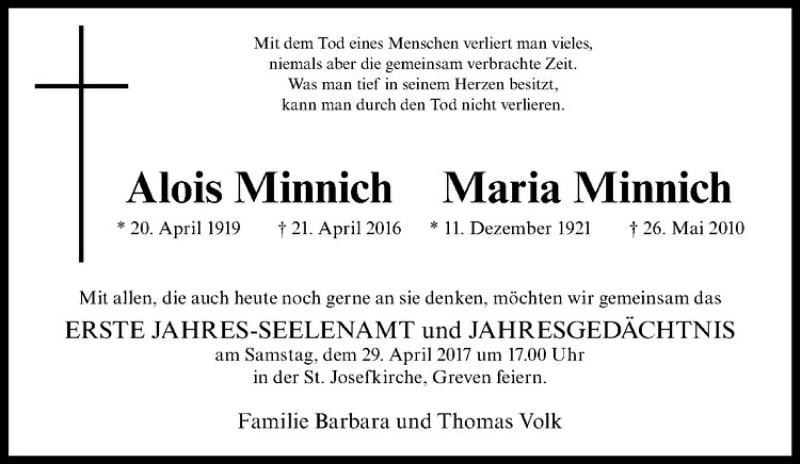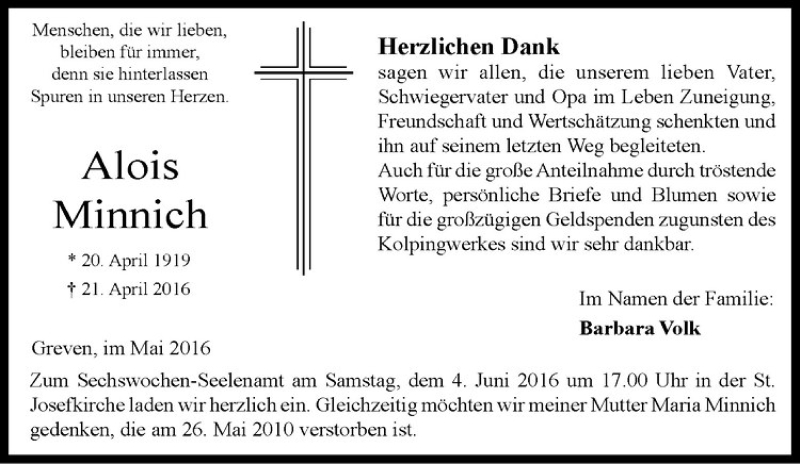 Hier finden Sie alle Traueranzeigen aus der Zeitung, die bisher für Alois Minnich erschienen sind. Weitere Traueranzeigen, die in der Zeitung erscheinen, werden hier ebenfalls aufgelistet