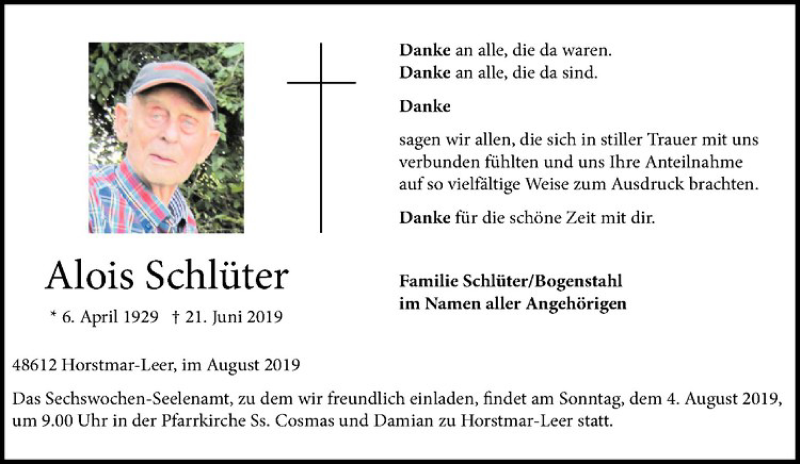 Hier finden Sie alle Traueranzeigen aus der Zeitung, die bisher für Alois Schlüter erschienen sind. Weitere Traueranzeigen, die in der Zeitung erscheinen, werden hier ebenfalls aufgelistet