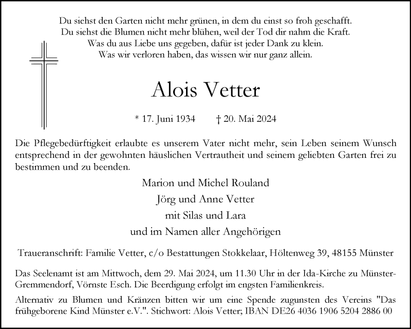 Hier finden Sie alle Traueranzeigen aus der Zeitung, die bisher für Alois Vetter erschienen sind. Weitere Traueranzeigen, die in der Zeitung erscheinen, werden hier ebenfalls aufgelistet