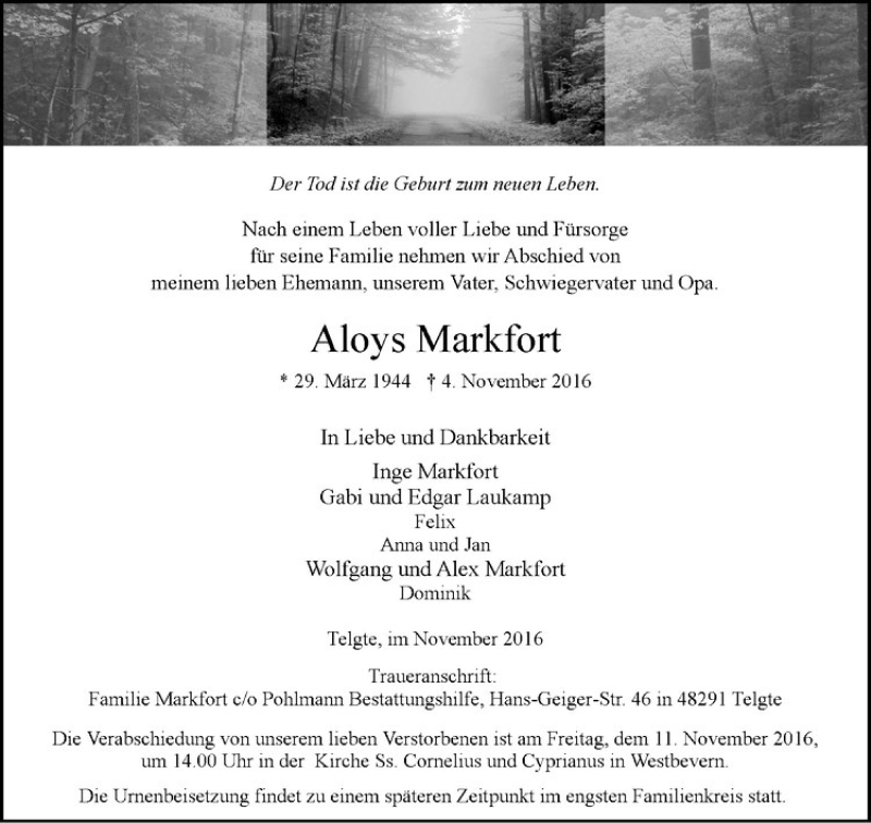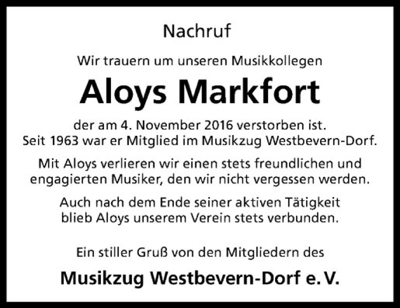 Hier finden Sie alle Traueranzeigen aus der Zeitung, die bisher für Aloys Markfort erschienen sind. Weitere Traueranzeigen, die in der Zeitung erscheinen, werden hier ebenfalls aufgelistet