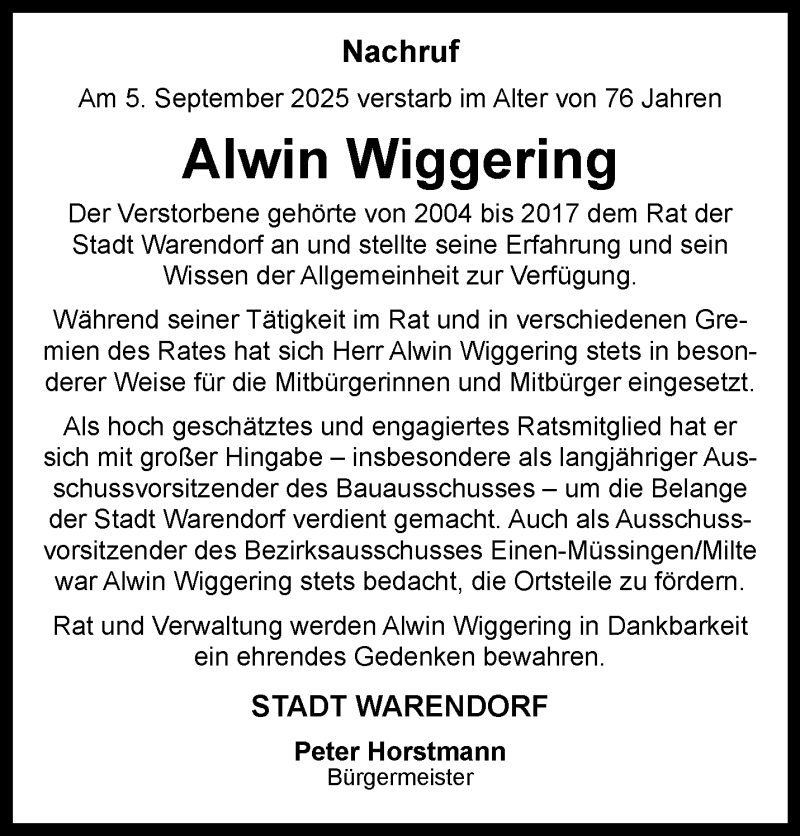 Hier finden Sie alle Traueranzeigen aus der Zeitung, die bisher für Alwin Wiggering erschienen sind. Weitere Traueranzeigen, die in der Zeitung erscheinen, werden hier ebenfalls aufgelistet