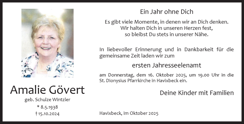 Hier finden Sie alle Traueranzeigen aus der Zeitung, die bisher für Amalie Gövert erschienen sind. Weitere Traueranzeigen, die in der Zeitung erscheinen, werden hier ebenfalls aufgelistet