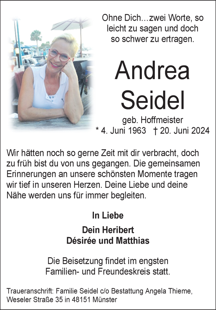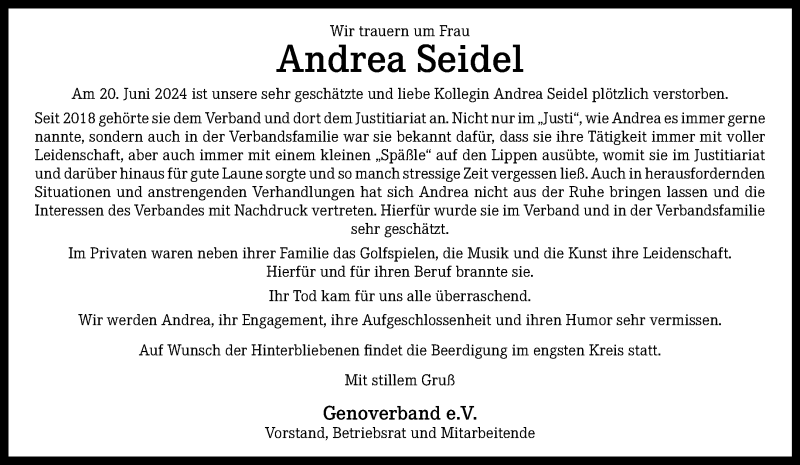 Hier finden Sie alle Traueranzeigen aus der Zeitung, die bisher für Andrea Seidel erschienen sind. Weitere Traueranzeigen, die in der Zeitung erscheinen, werden hier ebenfalls aufgelistet