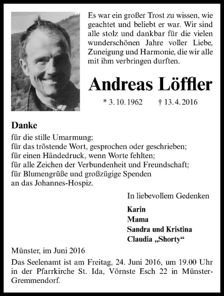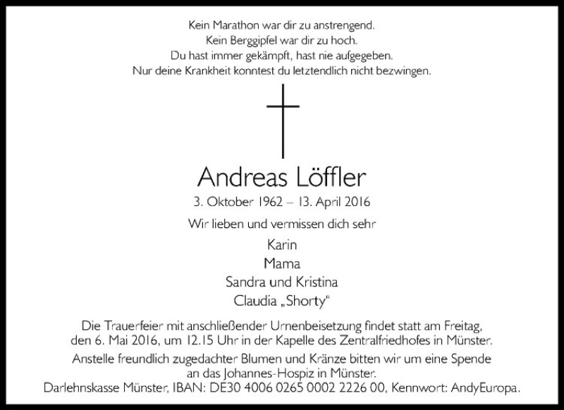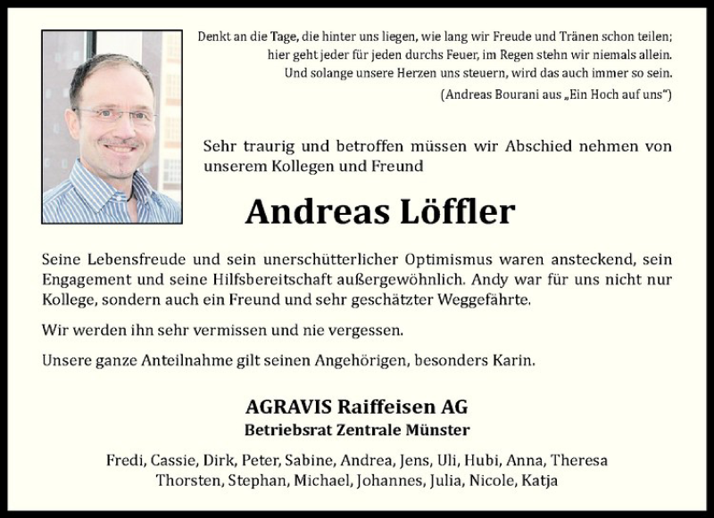 Hier finden Sie alle Traueranzeigen aus der Zeitung, die bisher für Andreas Löffler erschienen sind. Weitere Traueranzeigen, die in der Zeitung erscheinen, werden hier ebenfalls aufgelistet