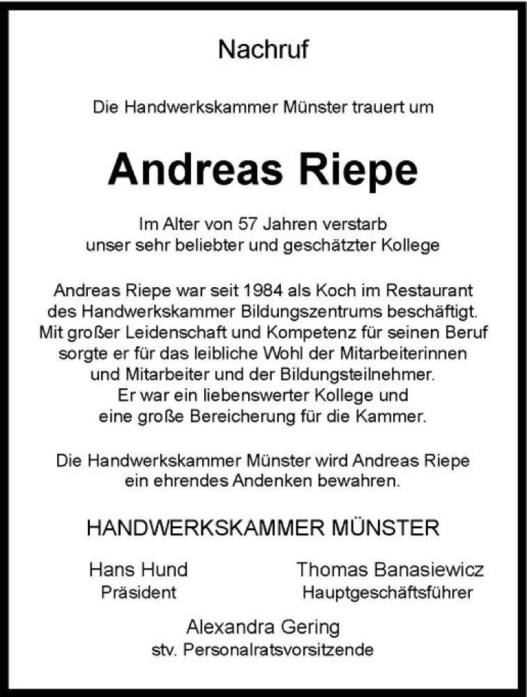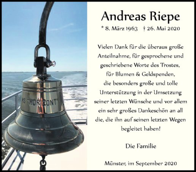 Hier finden Sie alle Traueranzeigen aus der Zeitung, die bisher für Andreas Riepe erschienen sind. Weitere Traueranzeigen, die in der Zeitung erscheinen, werden hier ebenfalls aufgelistet