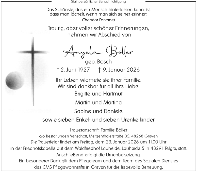 Hier finden Sie alle Traueranzeigen aus der Zeitung, die bisher für Angela Böller erschienen sind. Weitere Traueranzeigen, die in der Zeitung erscheinen, werden hier ebenfalls aufgelistet