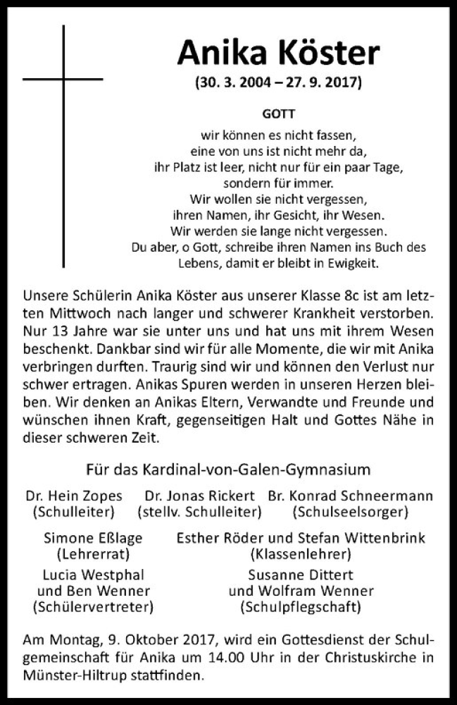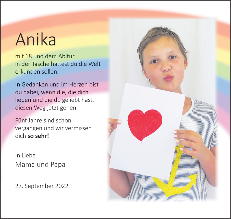 Hier finden Sie alle Traueranzeigen aus der Zeitung, die bisher für Anika Köster erschienen sind. Weitere Traueranzeigen, die in der Zeitung erscheinen, werden hier ebenfalls aufgelistet
