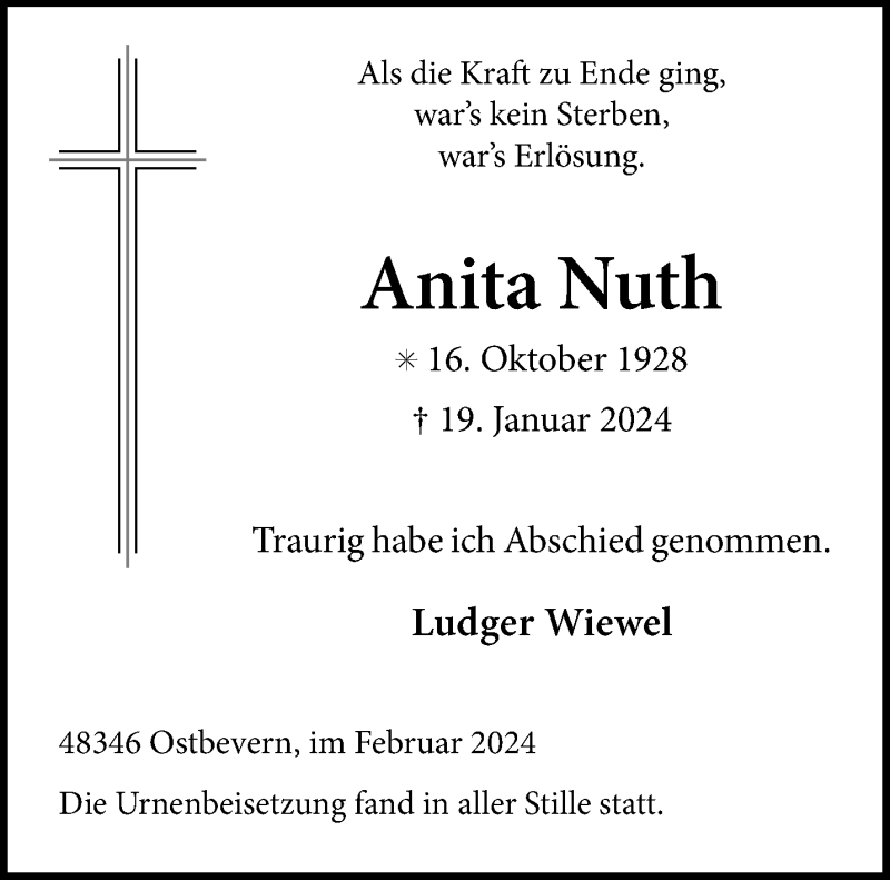 Hier finden Sie alle Traueranzeigen aus der Zeitung, die bisher für Anita Nuth erschienen sind. Weitere Traueranzeigen, die in der Zeitung erscheinen, werden hier ebenfalls aufgelistet