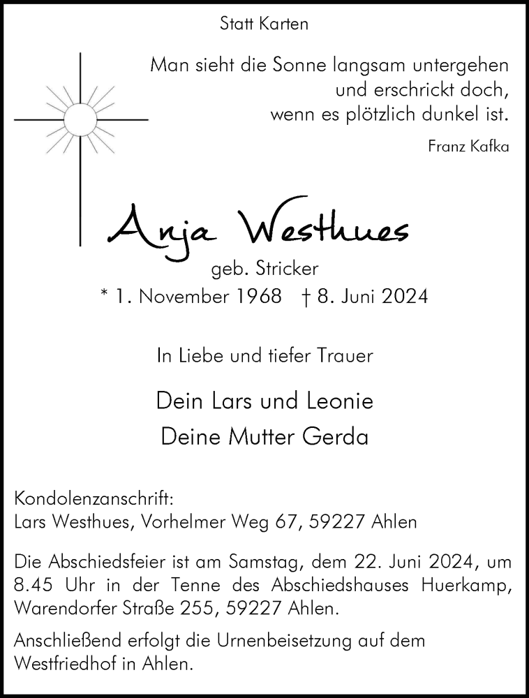 Hier finden Sie alle Traueranzeigen aus der Zeitung, die bisher für Anja Westhues erschienen sind. Weitere Traueranzeigen, die in der Zeitung erscheinen, werden hier ebenfalls aufgelistet