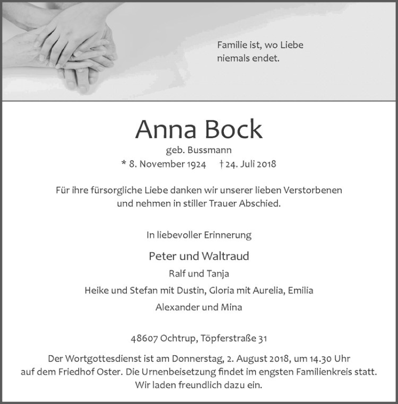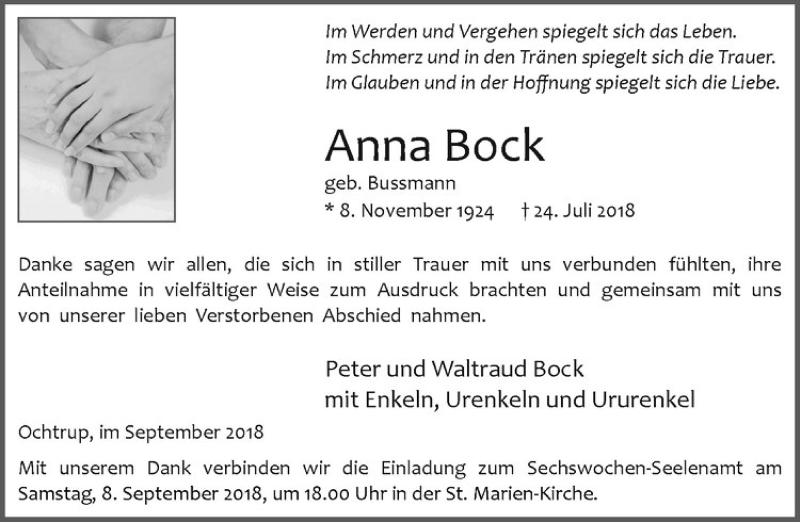 Hier finden Sie alle Traueranzeigen aus der Zeitung, die bisher für Anna Bock erschienen sind. Weitere Traueranzeigen, die in der Zeitung erscheinen, werden hier ebenfalls aufgelistet