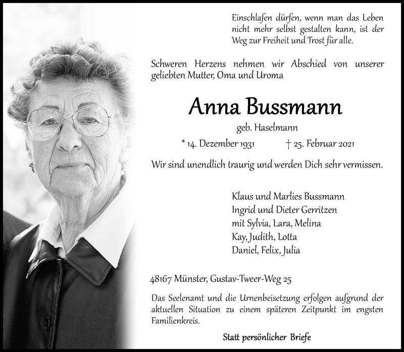 Hier finden Sie alle Traueranzeigen aus der Zeitung, die bisher für Anna Bussmann erschienen sind. Weitere Traueranzeigen, die in der Zeitung erscheinen, werden hier ebenfalls aufgelistet