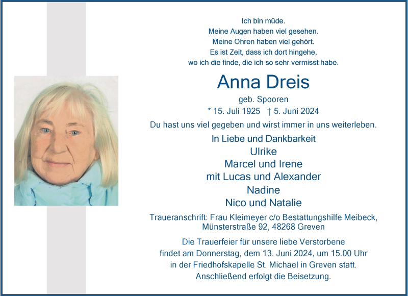 Hier finden Sie alle Traueranzeigen aus der Zeitung, die bisher für Anna Dreis erschienen sind. Weitere Traueranzeigen, die in der Zeitung erscheinen, werden hier ebenfalls aufgelistet