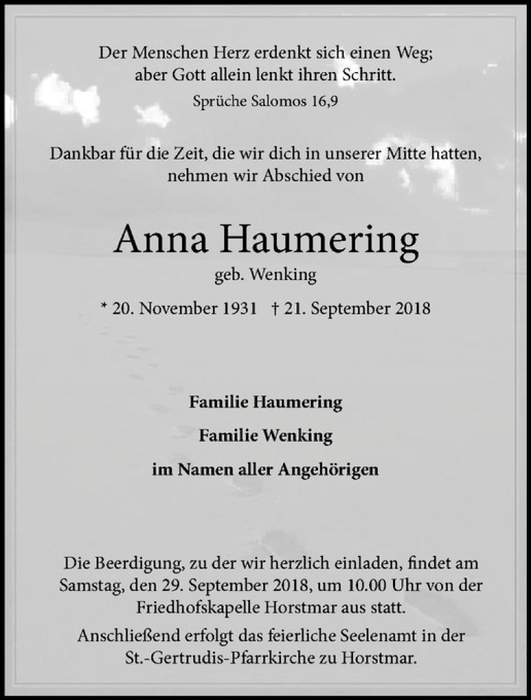 Hier finden Sie alle Traueranzeigen aus der Zeitung, die bisher für Anna Haumering erschienen sind. Weitere Traueranzeigen, die in der Zeitung erscheinen, werden hier ebenfalls aufgelistet