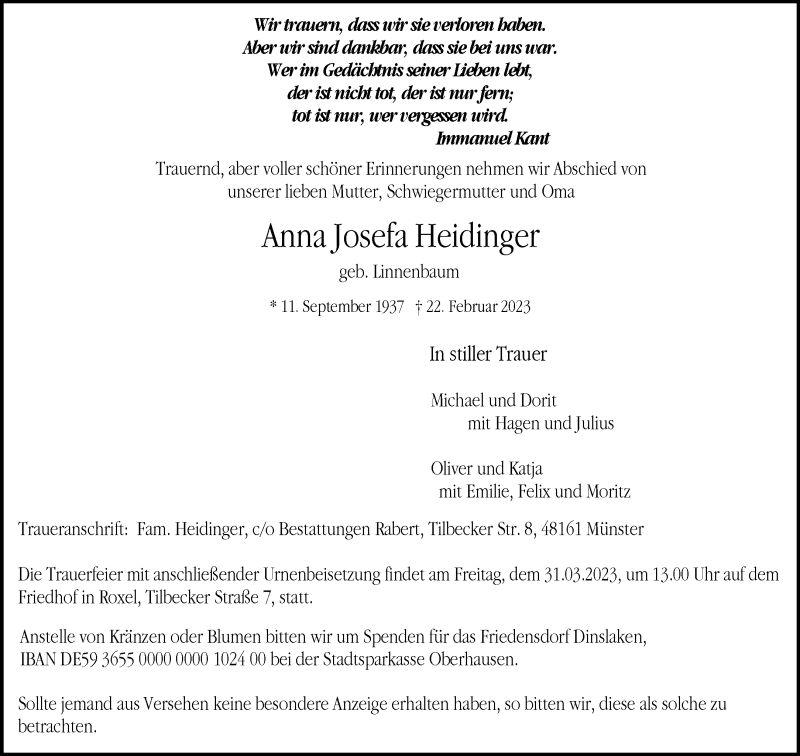 Hier finden Sie alle Traueranzeigen aus der Zeitung, die bisher für Anna Josefa Heidinger erschienen sind. Weitere Traueranzeigen, die in der Zeitung erscheinen, werden hier ebenfalls aufgelistet