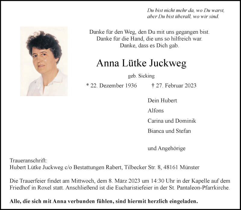 Hier finden Sie alle Traueranzeigen aus der Zeitung, die bisher für Anna Lütke Juckweg erschienen sind. Weitere Traueranzeigen, die in der Zeitung erscheinen, werden hier ebenfalls aufgelistet