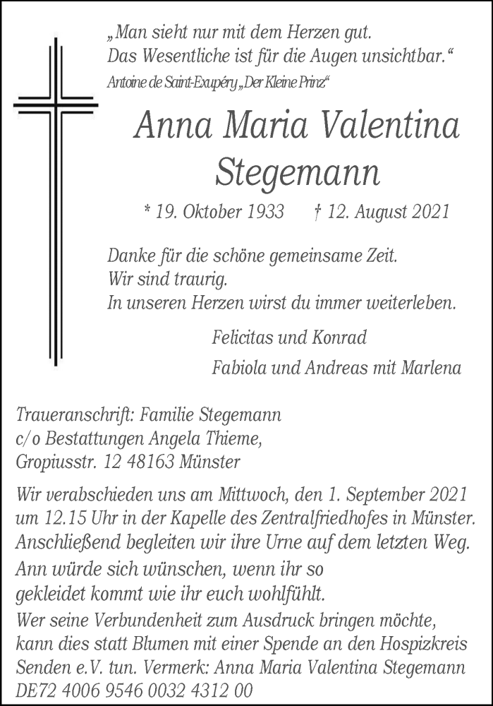 Hier finden Sie alle Traueranzeigen aus der Zeitung, die bisher für Anna Maria Valentina Stegemann erschienen sind. Weitere Traueranzeigen, die in der Zeitung erscheinen, werden hier ebenfalls aufgelistet