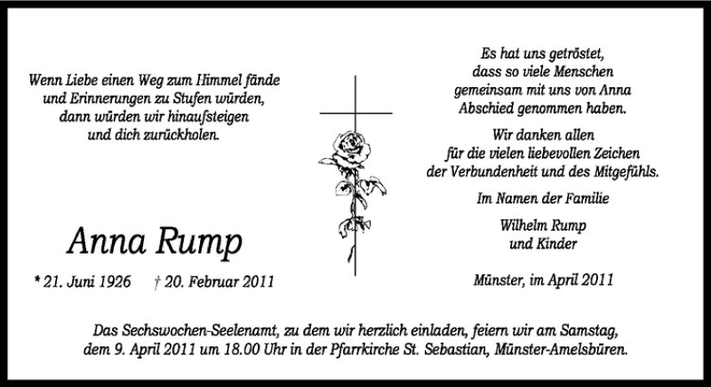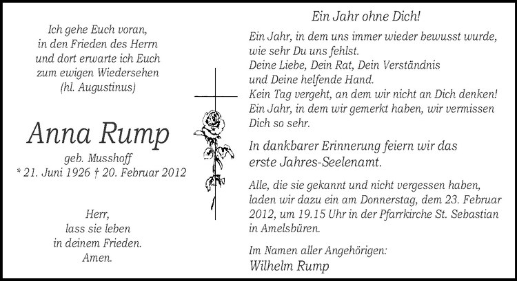 Hier finden Sie alle Traueranzeigen aus der Zeitung, die bisher für Anna Rump erschienen sind. Weitere Traueranzeigen, die in der Zeitung erscheinen, werden hier ebenfalls aufgelistet