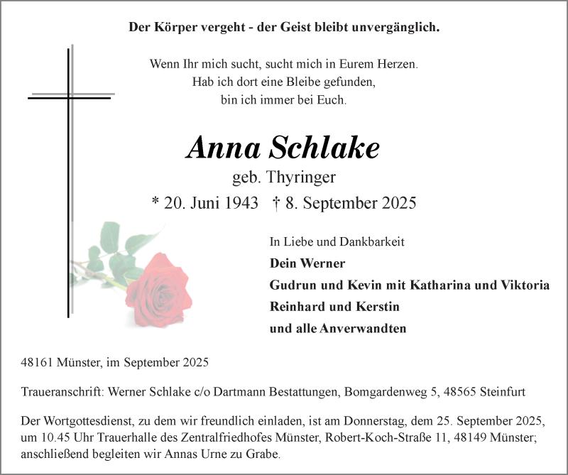 Hier finden Sie alle Traueranzeigen aus der Zeitung, die bisher für Anna Schlake erschienen sind. Weitere Traueranzeigen, die in der Zeitung erscheinen, werden hier ebenfalls aufgelistet