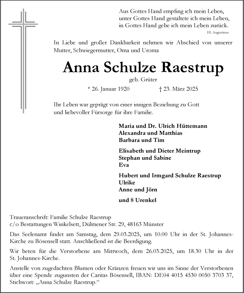 Hier finden Sie alle Traueranzeigen aus der Zeitung, die bisher für Anna Schulze Raestrup erschienen sind. Weitere Traueranzeigen, die in der Zeitung erscheinen, werden hier ebenfalls aufgelistet