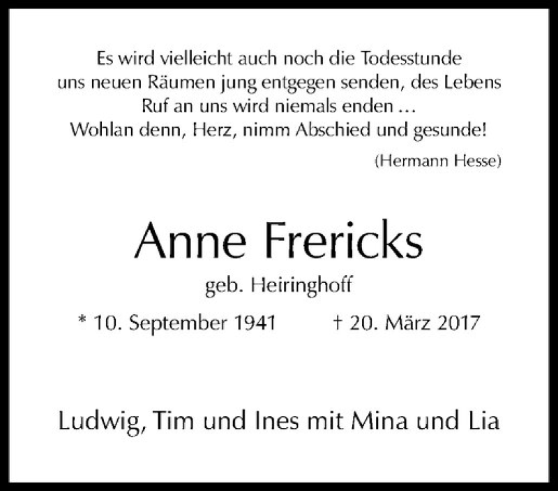 Hier finden Sie alle Traueranzeigen aus der Zeitung, die bisher für Anne Frericks erschienen sind. Weitere Traueranzeigen, die in der Zeitung erscheinen, werden hier ebenfalls aufgelistet