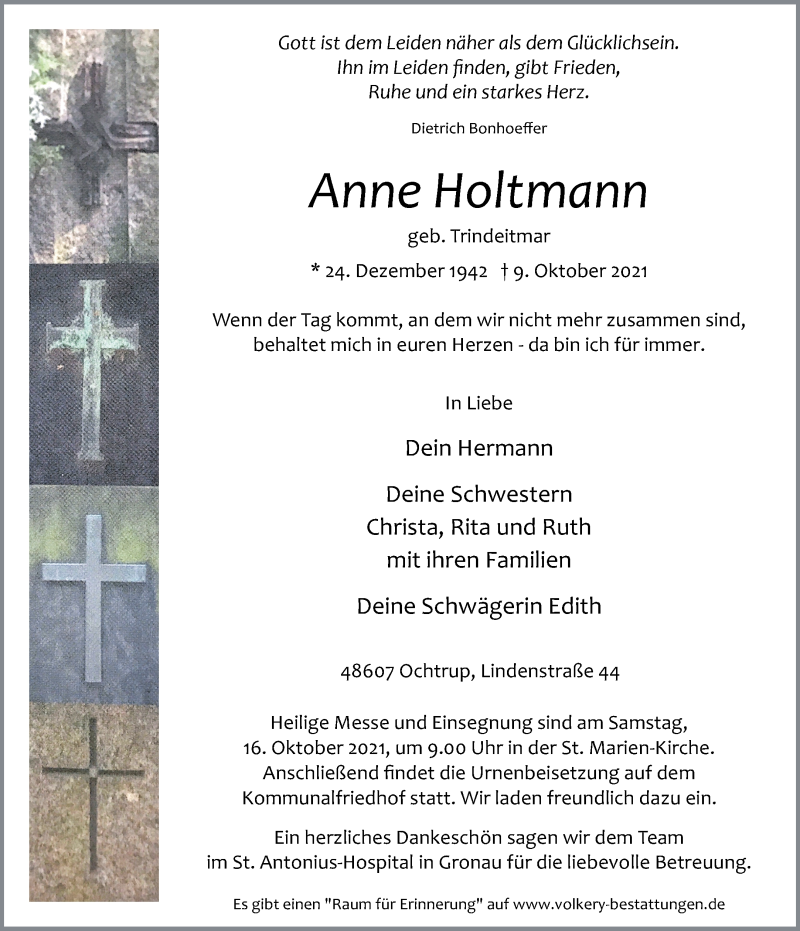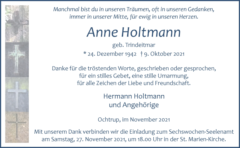 Hier finden Sie alle Traueranzeigen aus der Zeitung, die bisher für Anne Holtmann erschienen sind. Weitere Traueranzeigen, die in der Zeitung erscheinen, werden hier ebenfalls aufgelistet