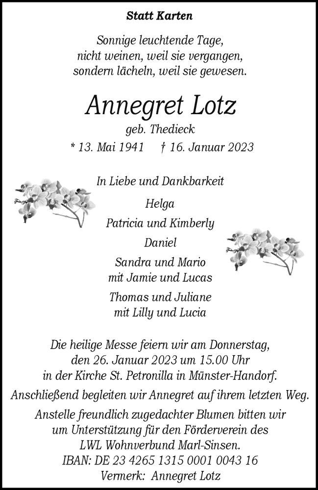 Hier finden Sie alle Traueranzeigen aus der Zeitung, die bisher für Annegret Lotz erschienen sind. Weitere Traueranzeigen, die in der Zeitung erscheinen, werden hier ebenfalls aufgelistet