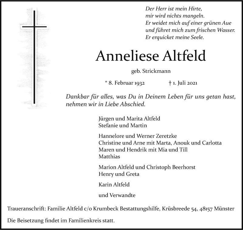 Hier finden Sie alle Traueranzeigen aus der Zeitung, die bisher für Anneliese Altfeld erschienen sind. Weitere Traueranzeigen, die in der Zeitung erscheinen, werden hier ebenfalls aufgelistet