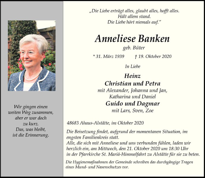 Hier finden Sie alle Traueranzeigen aus der Zeitung, die bisher für Anneliese Banken erschienen sind. Weitere Traueranzeigen, die in der Zeitung erscheinen, werden hier ebenfalls aufgelistet