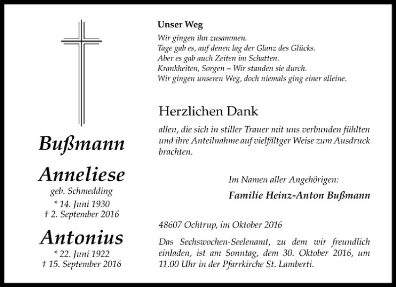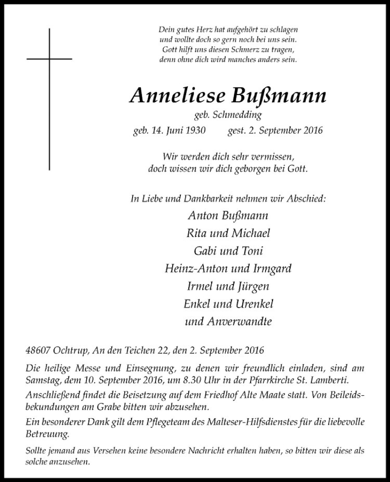 Hier finden Sie alle Traueranzeigen aus der Zeitung, die bisher für Anneliese Bußmann erschienen sind. Weitere Traueranzeigen, die in der Zeitung erscheinen, werden hier ebenfalls aufgelistet