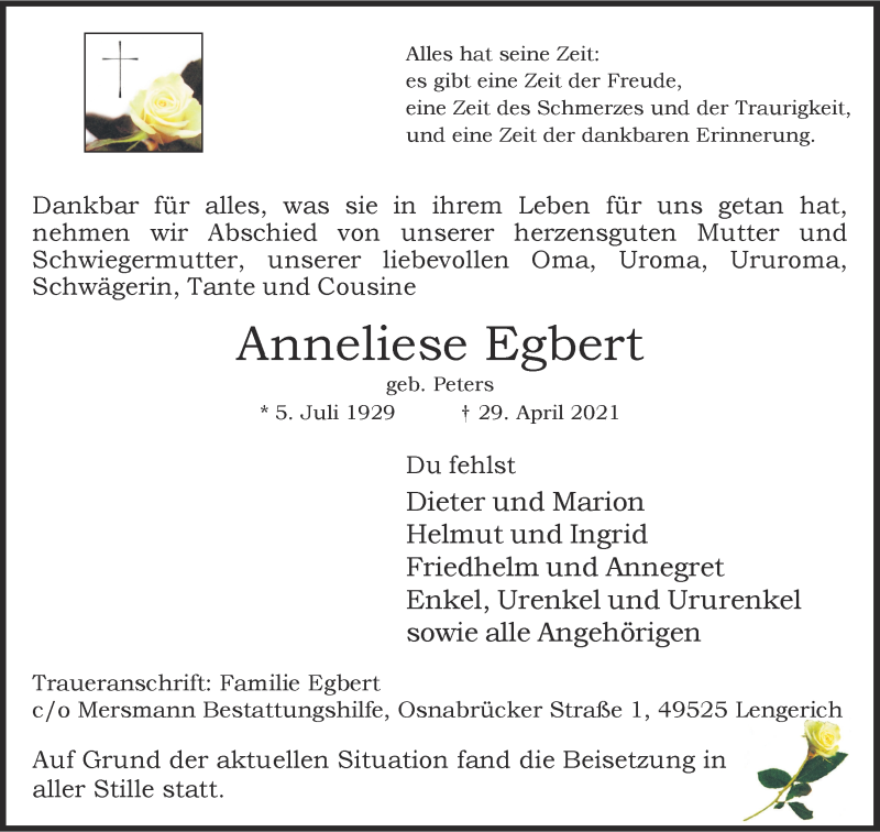 Hier finden Sie alle Traueranzeigen aus der Zeitung, die bisher für Anneliese Egbert erschienen sind. Weitere Traueranzeigen, die in der Zeitung erscheinen, werden hier ebenfalls aufgelistet