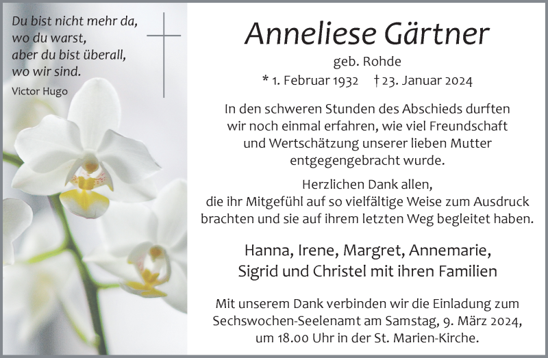 Hier finden Sie alle Traueranzeigen aus der Zeitung, die bisher für Anneliese Gärtner erschienen sind. Weitere Traueranzeigen, die in der Zeitung erscheinen, werden hier ebenfalls aufgelistet