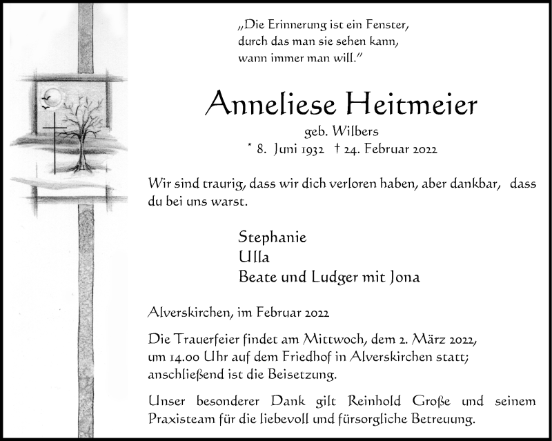 Hier finden Sie alle Traueranzeigen aus der Zeitung, die bisher für Anneliese Heitmeier erschienen sind. Weitere Traueranzeigen, die in der Zeitung erscheinen, werden hier ebenfalls aufgelistet