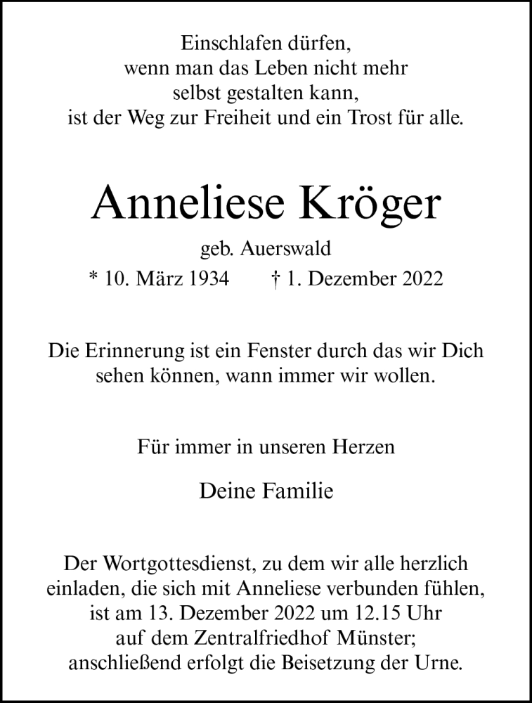 Hier finden Sie alle Traueranzeigen aus der Zeitung, die bisher für Anneliese Kröger erschienen sind. Weitere Traueranzeigen, die in der Zeitung erscheinen, werden hier ebenfalls aufgelistet