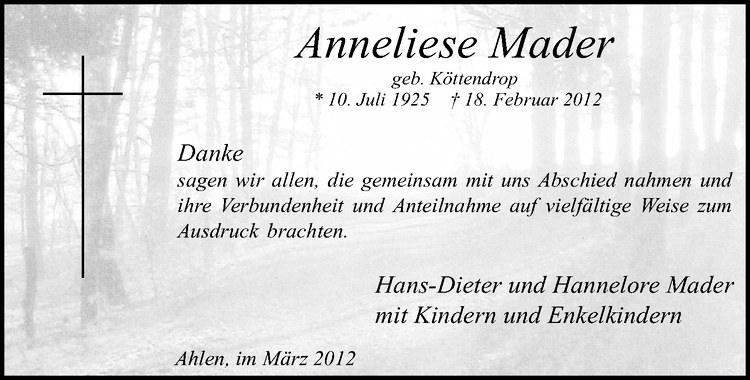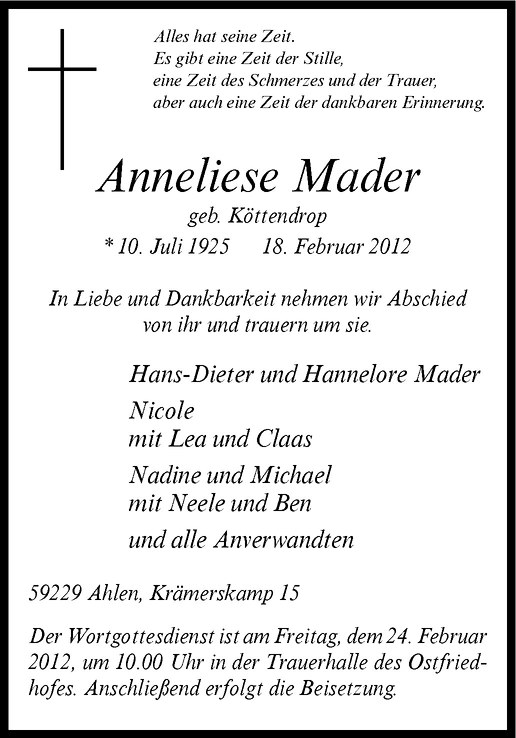 Hier finden Sie alle Traueranzeigen aus der Zeitung, die bisher für Anneliese Mader erschienen sind. Weitere Traueranzeigen, die in der Zeitung erscheinen, werden hier ebenfalls aufgelistet