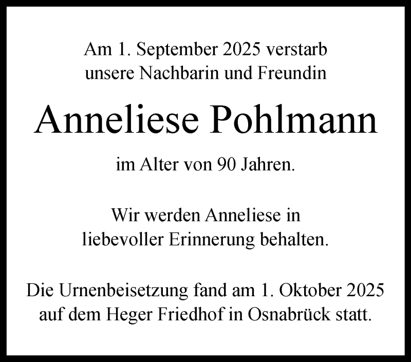 Hier finden Sie alle Traueranzeigen aus der Zeitung, die bisher für Anneliese Pohlmann erschienen sind. Weitere Traueranzeigen, die in der Zeitung erscheinen, werden hier ebenfalls aufgelistet