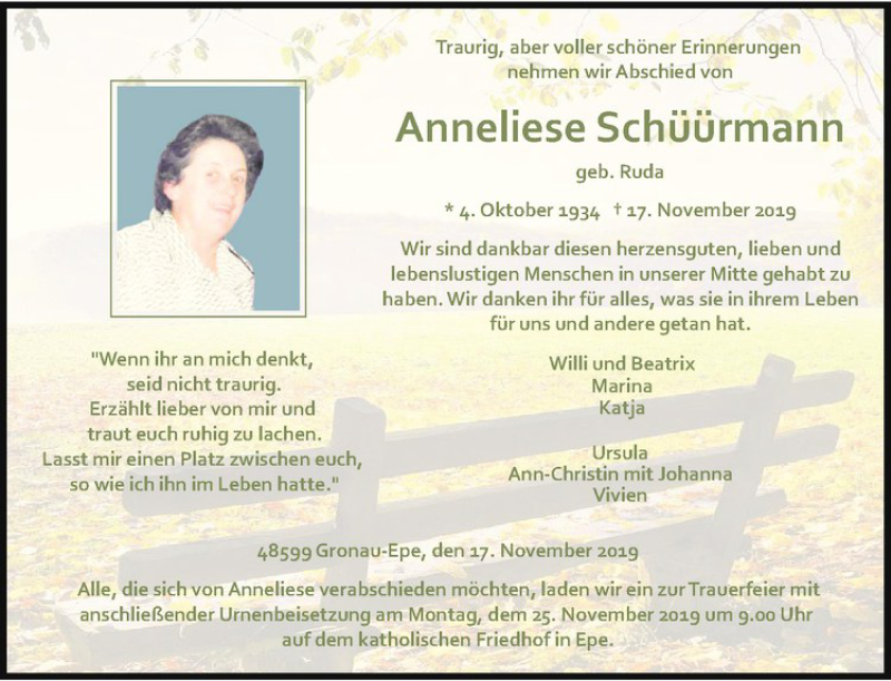 Hier finden Sie alle Traueranzeigen aus der Zeitung, die bisher für Anneliese Schüürmann erschienen sind. Weitere Traueranzeigen, die in der Zeitung erscheinen, werden hier ebenfalls aufgelistet