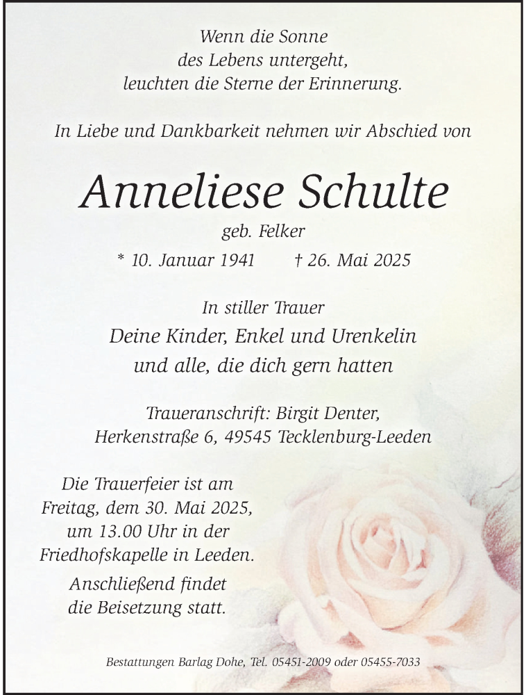 Hier finden Sie alle Traueranzeigen aus der Zeitung, die bisher für Anneliese Schulte erschienen sind. Weitere Traueranzeigen, die in der Zeitung erscheinen, werden hier ebenfalls aufgelistet