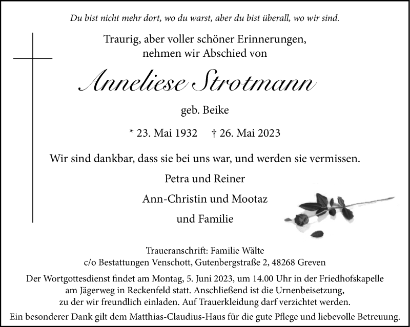 Hier finden Sie alle Traueranzeigen aus der Zeitung, die bisher für Anneliese Strotmann erschienen sind. Weitere Traueranzeigen, die in der Zeitung erscheinen, werden hier ebenfalls aufgelistet