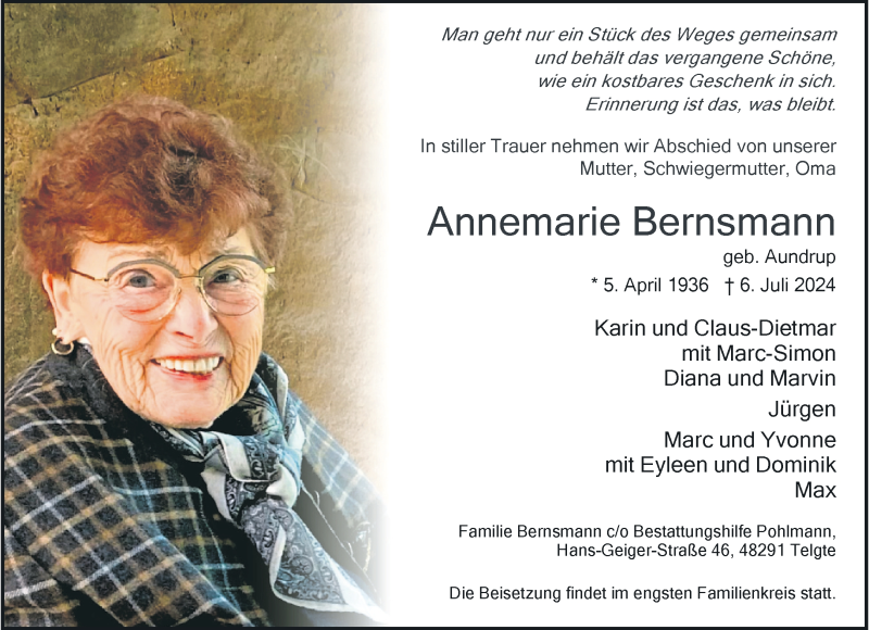 Hier finden Sie alle Traueranzeigen aus der Zeitung, die bisher für Annemarie Bernsmann erschienen sind. Weitere Traueranzeigen, die in der Zeitung erscheinen, werden hier ebenfalls aufgelistet