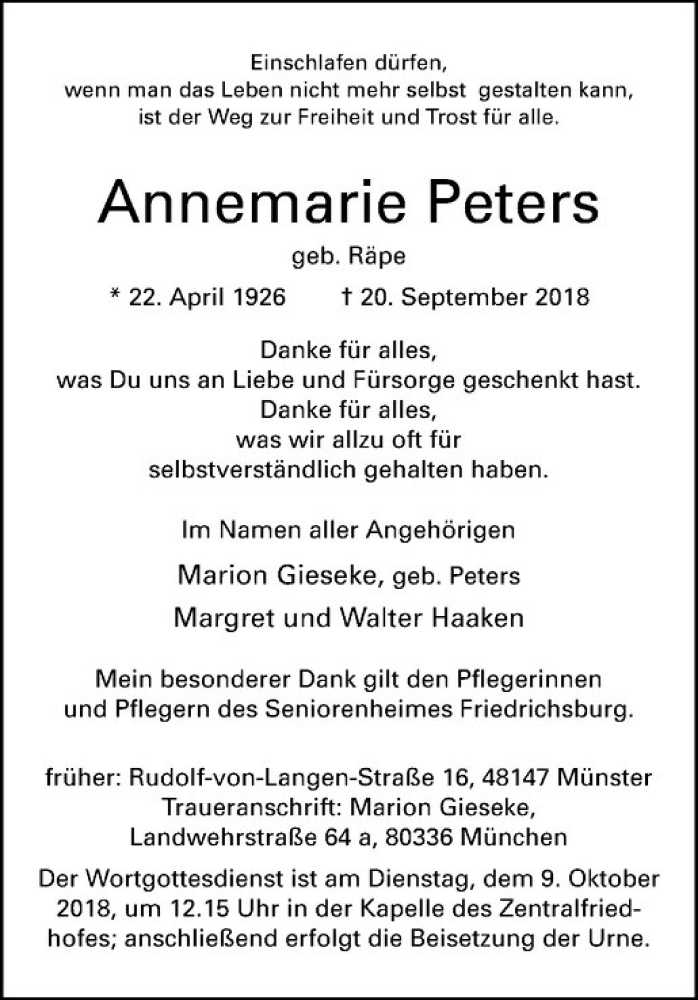 Hier finden Sie alle Traueranzeigen aus der Zeitung, die bisher für Annemarie Peters erschienen sind. Weitere Traueranzeigen, die in der Zeitung erscheinen, werden hier ebenfalls aufgelistet