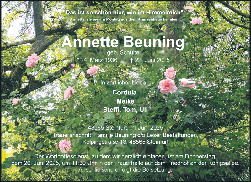 Hier finden Sie alle Traueranzeigen aus der Zeitung, die bisher für Annette Beuning erschienen sind. Weitere Traueranzeigen, die in der Zeitung erscheinen, werden hier ebenfalls aufgelistet