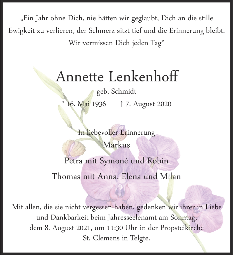 Hier finden Sie alle Traueranzeigen aus der Zeitung, die bisher für Annette Lenkenhoff erschienen sind. Weitere Traueranzeigen, die in der Zeitung erscheinen, werden hier ebenfalls aufgelistet