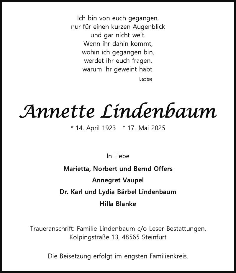 Hier finden Sie alle Traueranzeigen aus der Zeitung, die bisher für Annette Lindenbaum erschienen sind. Weitere Traueranzeigen, die in der Zeitung erscheinen, werden hier ebenfalls aufgelistet